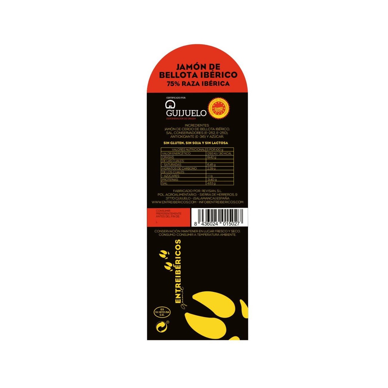 • Ingrédients : Jambon ibérique bellota, sel, conservateurs (E-252, E-250), antioxydant (E-316) et sucre. SANS GLUTEN, SANS SOJA et SANS LACTOSE.