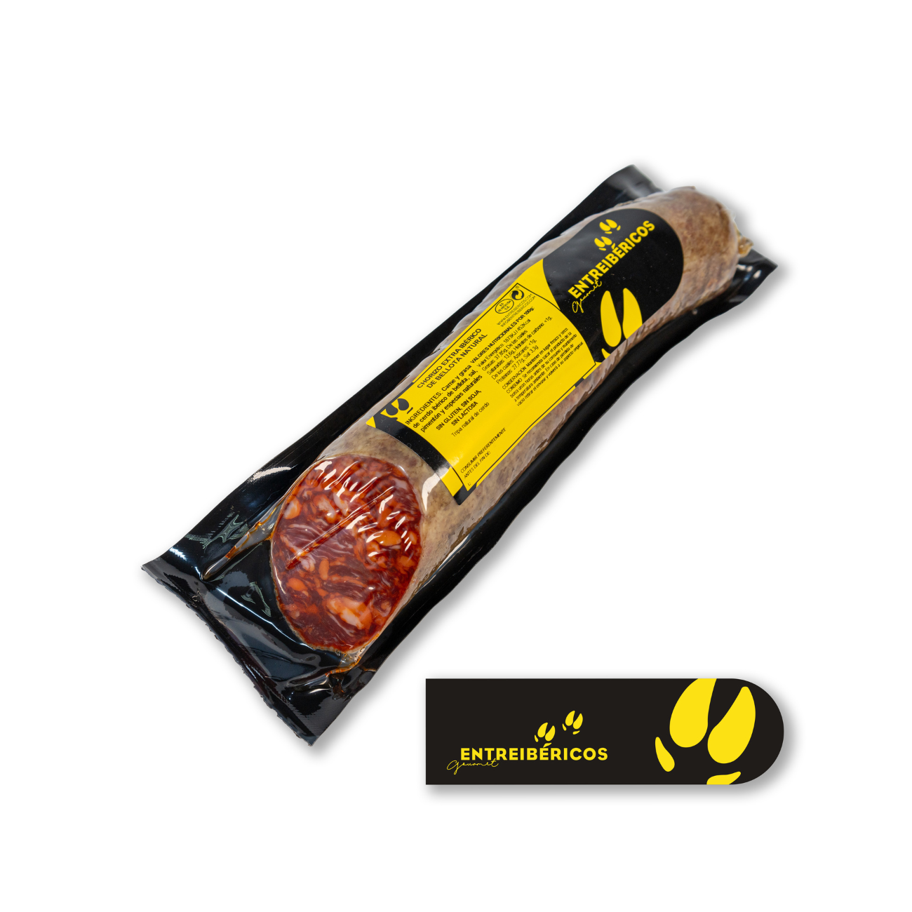 • Ingrédients : Viande et graisse de porc ibérique nourri au gland, sel marin, paprika et épices naturelles. SANS GLUTEN, SANS SOJA, SANS LACTOSE. Boyau naturel.