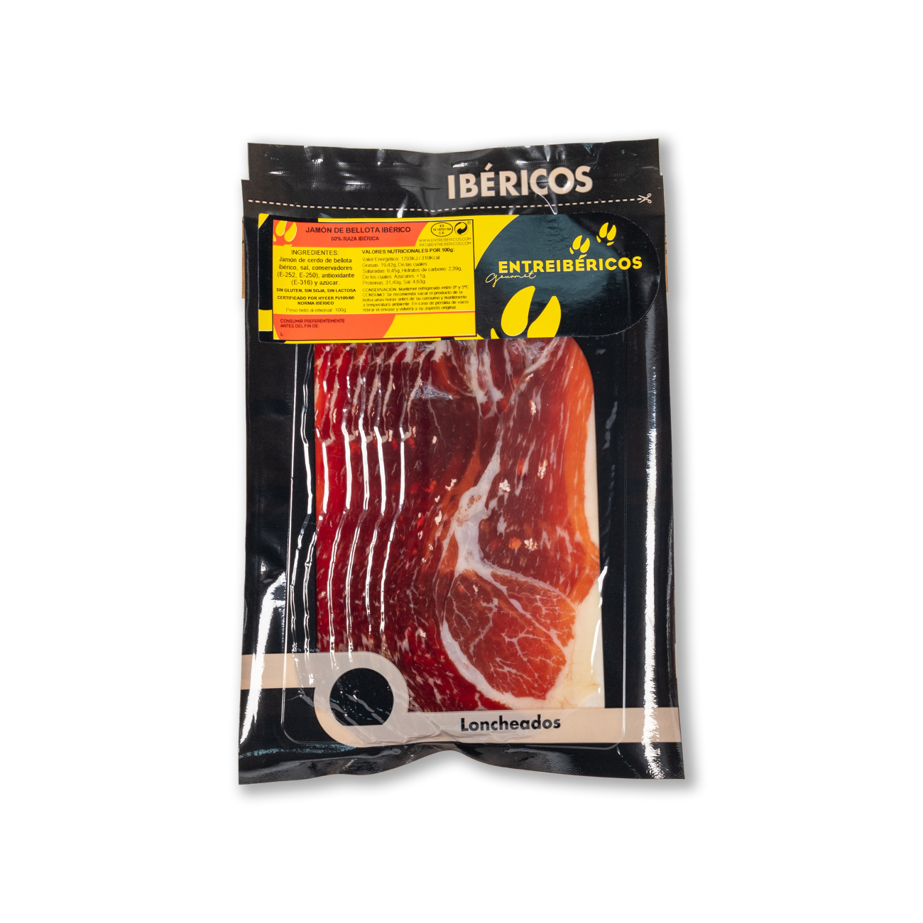 Sachet de 100 gr. de jambon bellota ibérique 50 % race ibérique emballé sous vide.
