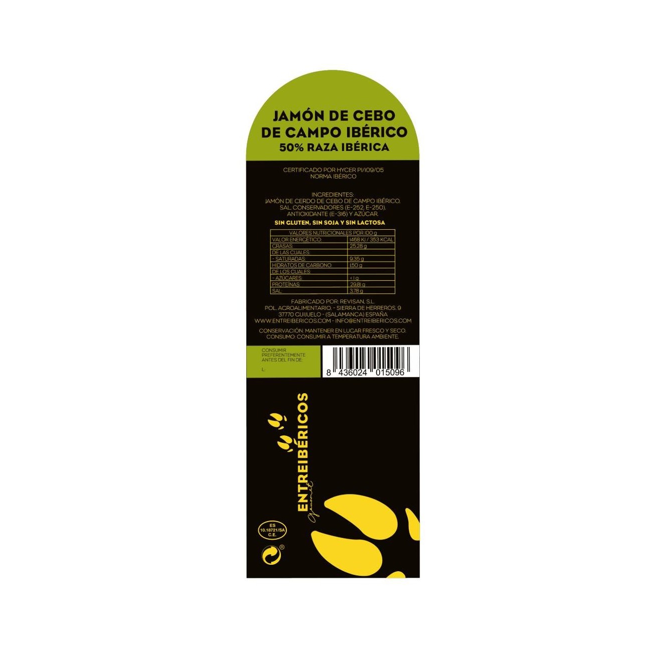 • Ingredients: Cebo de Campo Iberico ham, salt, preservatives (E-252, E-250), antioxidant (E-316) and sugar. GLUTEN-FREE, SOYA-FREE, LACTOSE-FREE