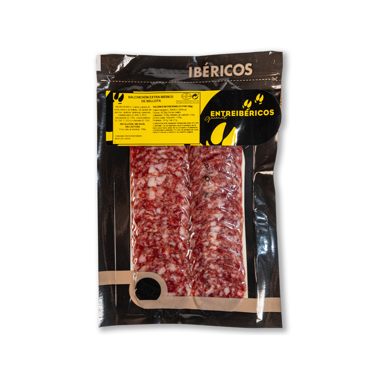 100 g packet of SUPERIOR quality acorn-fed Iberico sliced Spanish salchichón salami extra, sliced and vacuum packed.