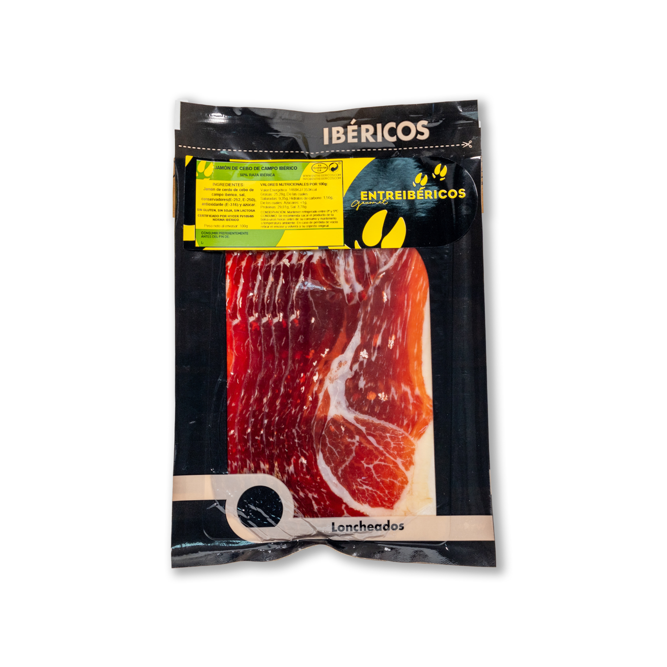 • Ingredients: Cebo de Campo Iberico ham, salt, preservatives (E-252, E-250), antioxidant (E-316) and sugar. GLUTEN-FREE, SOYA-FREE, LACTOSE-FREE.