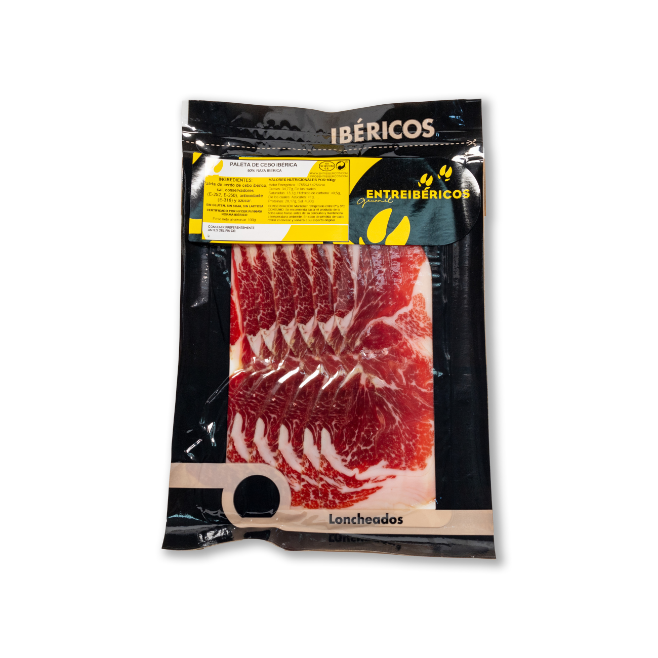 100 g packet of Cebo Iberico shoulder ham 50% Black Iberian, sliced and vacuum packed.