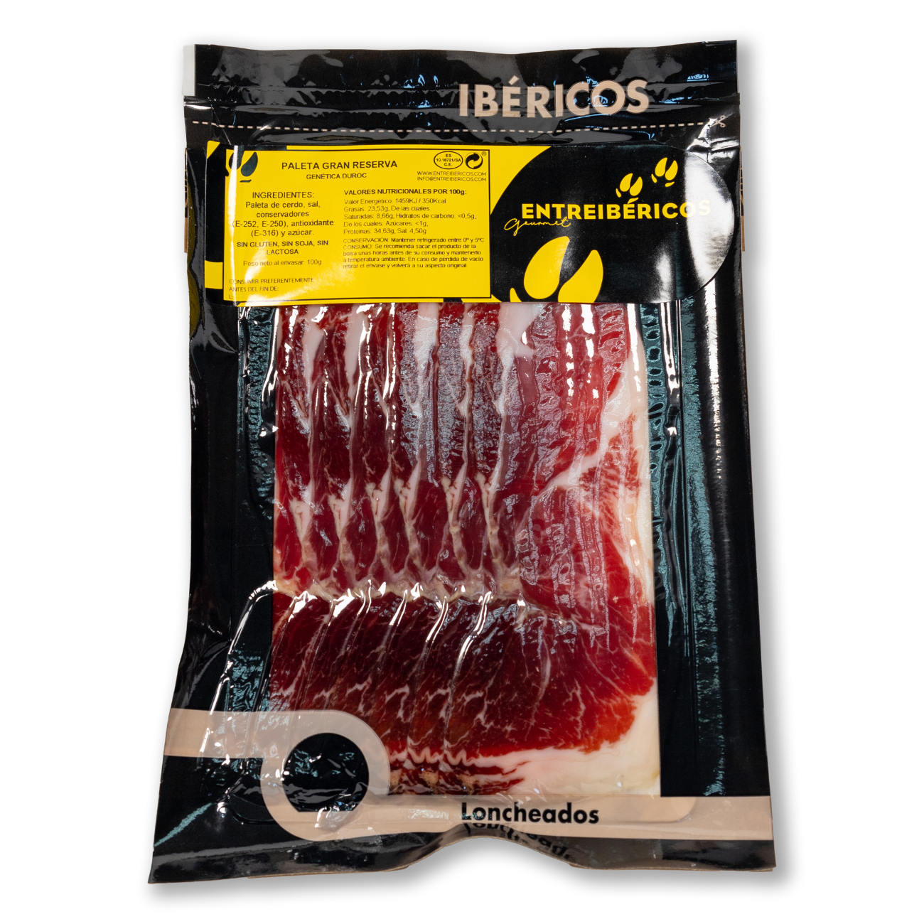 100 g packet of Gran Reserva Duroc ham sliced shoulder, sliced and vacuum packed.