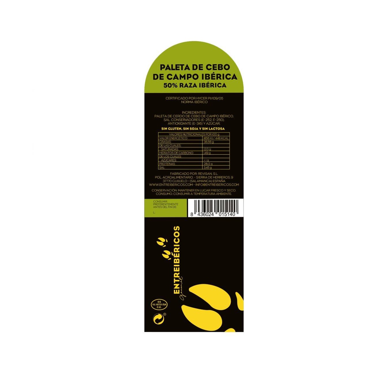 • Ingredients: Cebo de Campo Iberico shoulder ham, salt, preservatives (E-252, E-250), antioxidant (E-316) and sugar. GLUTEN-FREE, SOYA-FREE, LACTOSE-FREE.