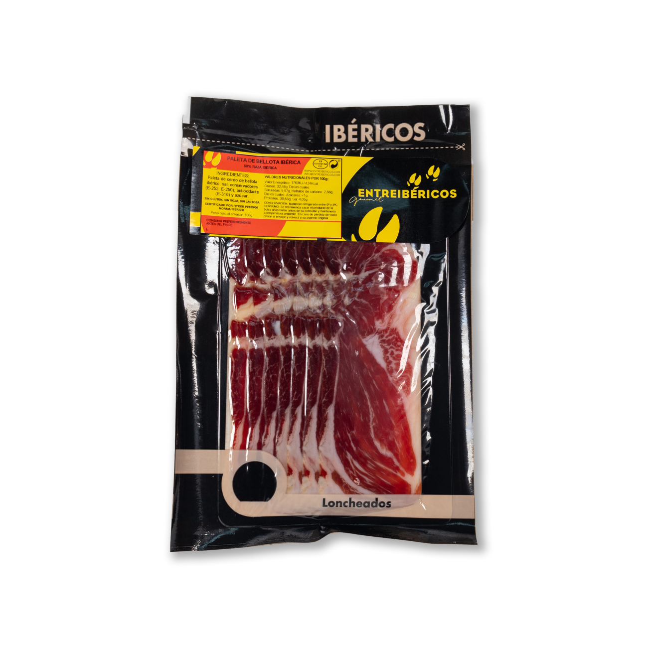 100 g packet of acorn-fed Iberico shoulder ham 50% Black Iberian, sliced and vacuum packed.