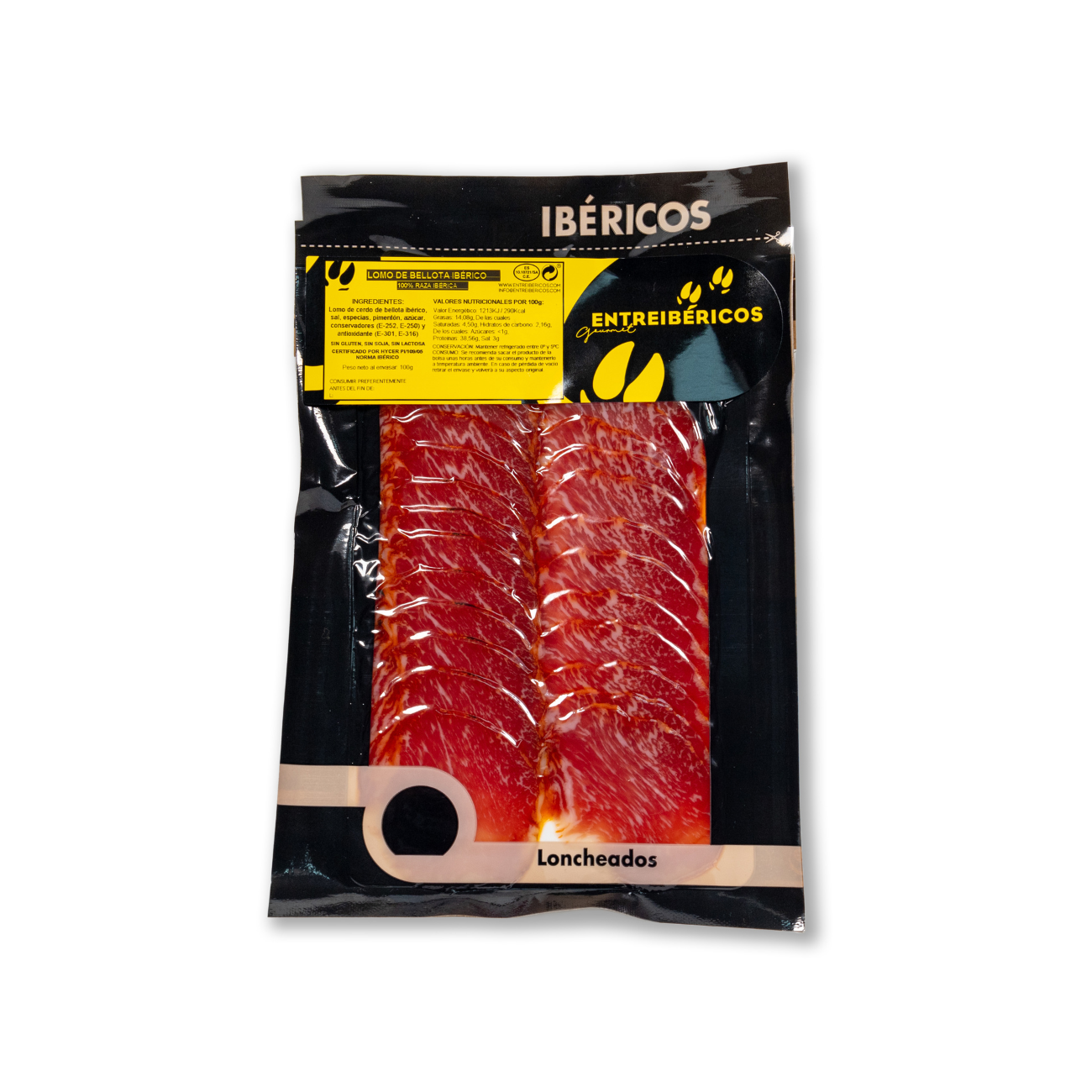 • Ingredients: Acorn-fed 100% Iberico pork loin, salt, spices, paprika, sugar, pork protein, preservatives (E-252, E-250) and antioxidants (E-301, E-316). GLUTEN-FREE, SOYA-FREE, LACTOSE-FREE. Synthetic casings.